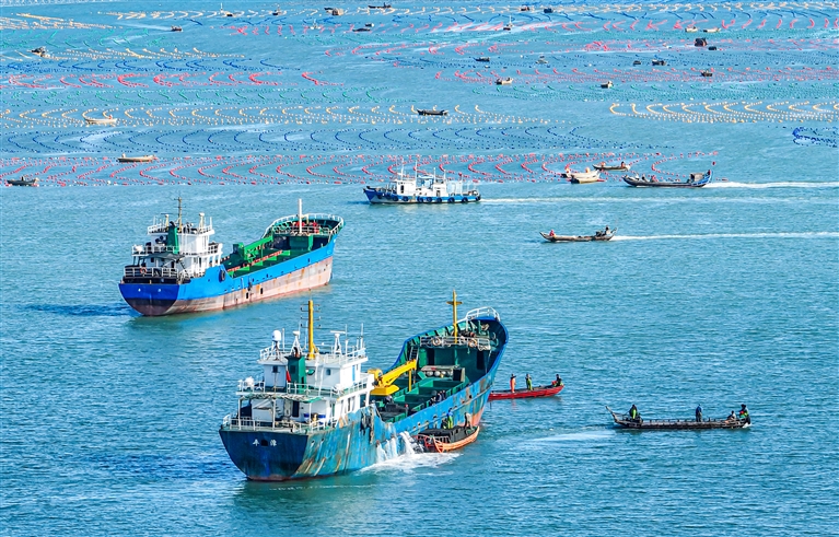 11月4日,在荣成市爱伦湾海域鲍鱼养殖区,养殖户将鲍鱼装船(无人机照片)。当日,山东省荣成市的部分鲍鱼养殖户将鲍鱼装船发往福建海域继续养殖,鲍鱼开启“南下”越冬之旅。