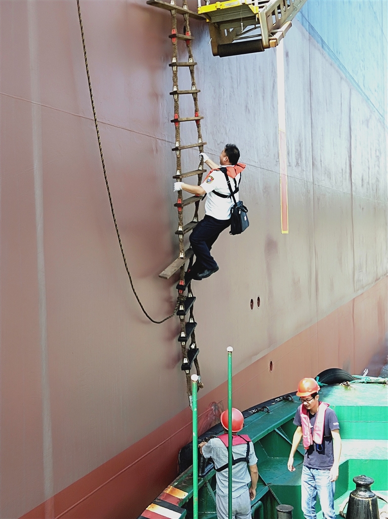 在引航过程中,引航员通常需要徒手攀爬十几米高的引航绳梯登离巨轮。风浪大的时候,引航艇会随着海浪剧烈颠簸,释放引航梯的大船也在颠簸起伏,从引航梯跳到引航艇的过程中,稍有不慎就会摔倒受伤。而每一次,王振祥总能以精湛的专业技术、丰富的实战经验化险为夷。