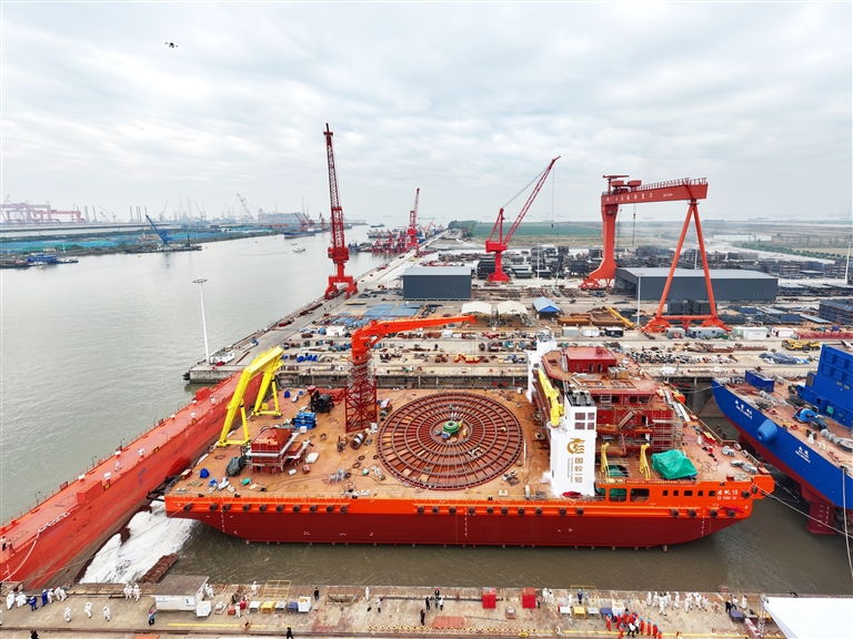 本报讯 全国首个国家海洋输电技术品牌“国蛟一号”再添利器。昨天,由国网舟山供电公司自主研发的全国最大海缆施工船“启帆19”号正式下水(见图)。
