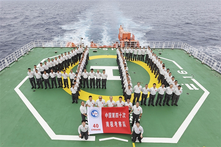 11月10日,中国第40次南极考察队在“雪龙2”号上排列成“40”字样的队形合影留念。