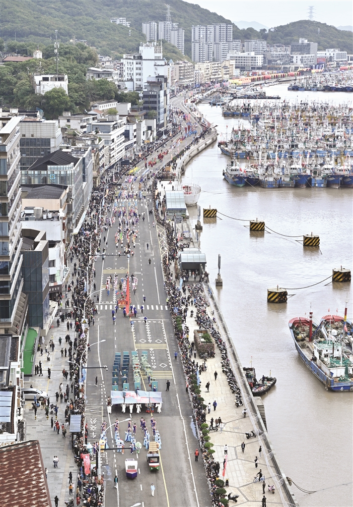 锣鼓、渔工号子等民间艺术方阵在沈家门渔港巡游