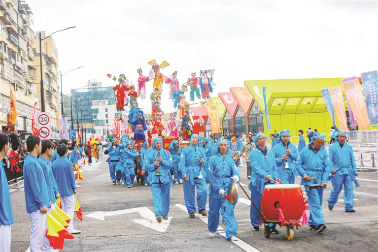 在仪式篇《逐梦渔港》里,普陀区下辖的10个镇街、管委会生动再现了传统渔民的生产技能,吸引了众多市民和游客驻足观看。茶摊、早点摊、糖水摊、街边卖艺……行进篇《寻梦百年》通过搭建沈家门渔港商贾云集的繁华景象,展现沈家门作为古代“东亚海上丝绸之路”重要港口的魅力。