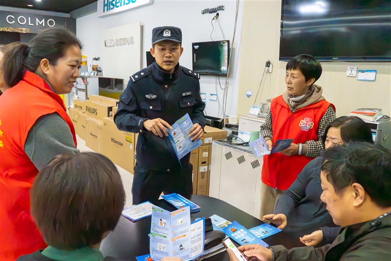 沈佳杰联合社区志愿服务队,走进商家店铺开展反诈宣传