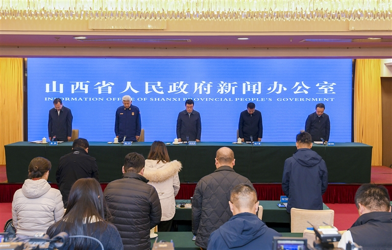 11月17日,山西省人民政府新闻办公室在吕梁市离石区召开情况通报会。这是通报会前,参会人员向事故遇难者默哀。 新华社 发(刘亮亮 摄)