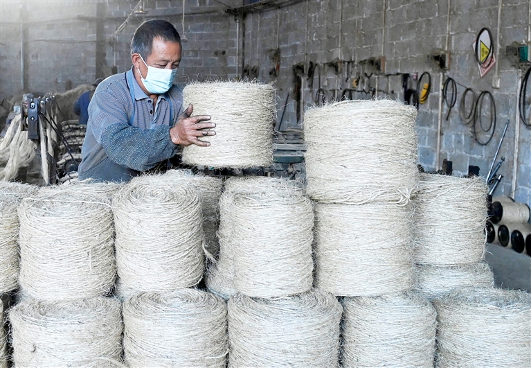11月20日,在广西平果市旧城镇一家企业,工人在搬运剑麻产品。