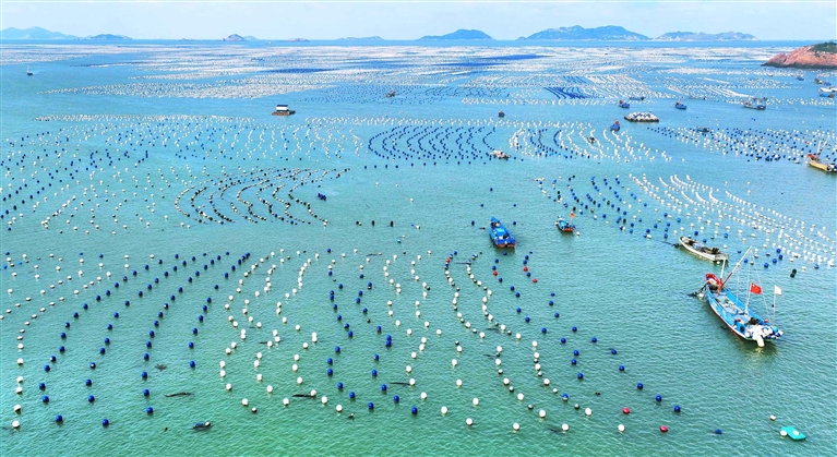 近日,总投入约3000万元购置的249.5万只蓝白色新型环保浮球,在嵊泗县贻贝海上养殖场全面安装完成。据了解,环保浮球替代了过去使用寿命短、易破碎成不易降解碎片的泡沫浮球,将有效提升贻贝养殖生态环保水平。摄影 记者 陈永建