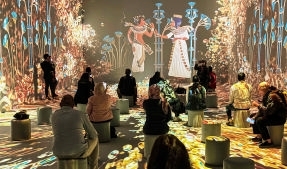 11月20日,人们在埃及吉萨的大埃及博物馆参观图坦卡蒙沉浸式展览。当日,图坦卡蒙沉浸式展览在大埃及博物馆开幕。观众可通过现场绚丽的视觉效果和配乐沉浸式了解法老图坦卡蒙的故事,以及古埃及的历史文化。 新华社 发(艾哈迈德·戈马 摄)