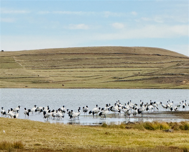 黑颈鹤被称为“鸟类大熊猫”,是国家一级重点保护野生动物。位于云南省昭通市昭阳区的大山包黑颈鹤国家级自然保护区,是我国黑颈鹤单位面积数量分布最多的保护区之一。自建立保护区以来,这里逐渐成为黑颈鹤在云贵高原上最重要的越冬栖息地和迁徙中转站。