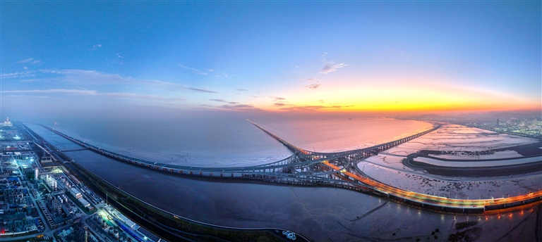 昨天清晨,从宁波甬江的出海口眺望,目前亚洲最大的海上互通——滨海互通,犹如一朵莲花绽放在波光粼粼的东海灰鳖洋上。杭甬高速复线宁波段一期采用双向六车道高速公路标准建设,设计速度120公里/小时,分为东西两段,其中东段路线长约40.5公里,分别连接金塘大桥、杭州湾大桥南接线和杭甬高速复线三期北仑方向。项目已进入通车倒计时。摄影 通讯员 姚峰 施蕾蕾