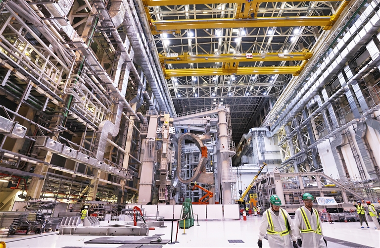 穿过预组装大厅,登上俯瞰台,记者隔窗看到了逐层安装中的托卡马克。承担托卡马克主机安装一号合同的中法联合体副总经理、中国核工业二三建设有限公司项目经理高德升告诉记者,2020年5月,重达1250吨的杜瓦底座吊装完成,拉开了ITER主设备安装的序幕。如今,托卡马克装置下部冷屏、最后一个下部主要磁体部件——极向场超导线圈均已成功落位。