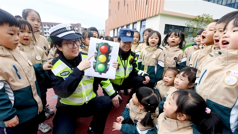 12月1日,在浙江省台州市路桥区南官实验幼儿园,交通警察给小朋友们讲解交通指示灯的变化和用途。2023年12月2日是第十二个“全国交通安全日”,主题为“文明交通 你我同行”。新华社 发(王保初 摄)