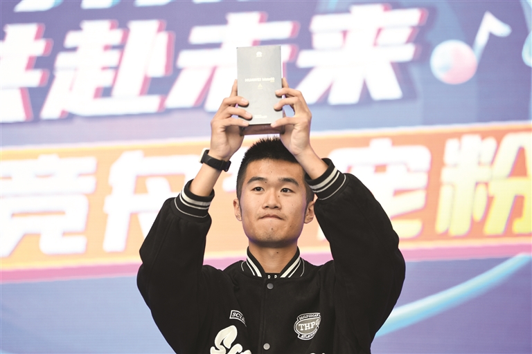五轮抽奖活动穿插其中,奖品有华为Mate60手机、纯金项链等。“上次在竞舟客户端上参加了抽奖活动,抽到了华为手机。这次看到有线下粉丝节,就第一时间来现场参与一下。”市民王俊珩来到宠粉节现场,积极参与到抽奖活动中,希望好运能再次降临。23岁岱山小伙幸运地捧回华为Mate60手机大奖(见图二)。他说,从去年开始关注“竞舟”客户端,从中获取各类信息,希望“竞舟”越办越好。