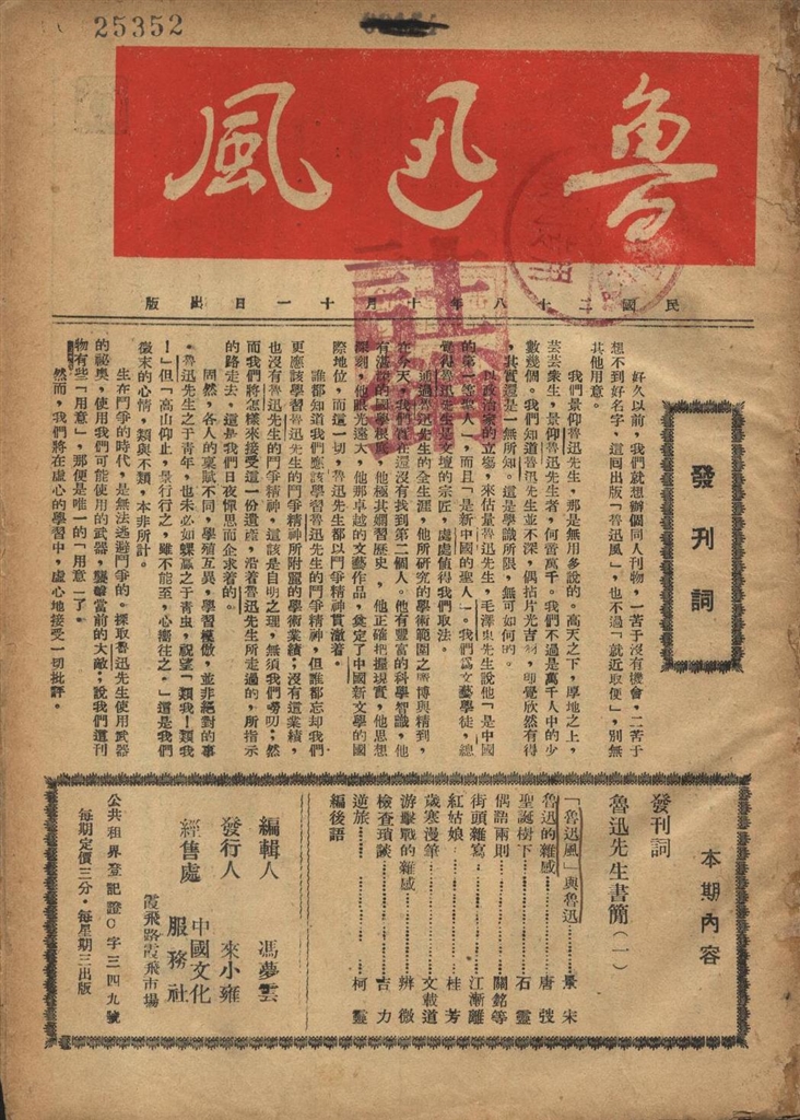 我曾藏有全套19期《鲁迅风》,其中有6期发表了鲁迅的书信、日记和手迹,以及瞿秋白生前未刊诗稿。发表纪念、研究鲁迅文章24篇,发表介绍新四军和“江抗”的通讯特写《江南通讯》《二十一天》,以及《徐特立访问记》。持续发表郑振铎、王统照、陈望道、许广平、巴金、李健吾、赵景深、萧军、萧红等“五四”以来的新老作家作品四十余篇。总之,金性尧一个非党编辑,在不知情的情况下,在全部19期二百六十多篇文章中,发表中共党员作家作品八十余篇,占比达三分之一,这是难能可贵的。