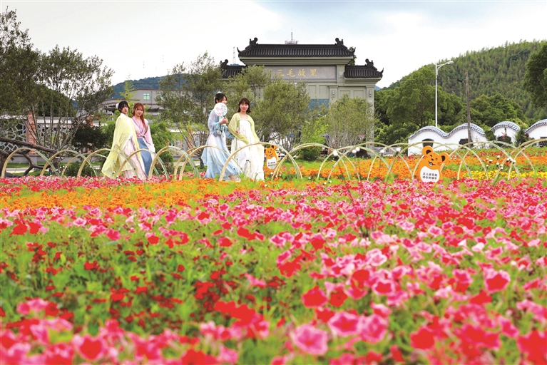 定海区小沙街道庙桥村,汉服爱好者穿行在三毛公园的花海间 图/张磊
