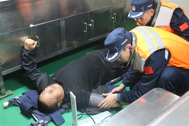 接警后,海警救援指挥中心立即指派就近的庄海舰前往救援,并要求该渔船立即返航,尽快与庄海舰碰头。5日凌晨,庄海舰驶抵事发海域并成功靠泊涉事渔船。当时该海域涌浪较大,两艘船随着风浪摇摆,救援难度较大。海警执法员瞅准时机,在两船距离最近时果断跳帮,并将患病渔民运至庄海舰,由随舰卫生员对其进行初步救护(见图)。5日早上7时许,在航行12小时、200多海里后,庄海舰成功将患者运送至沈家门台轮码头,患者随即被送至附近医院。