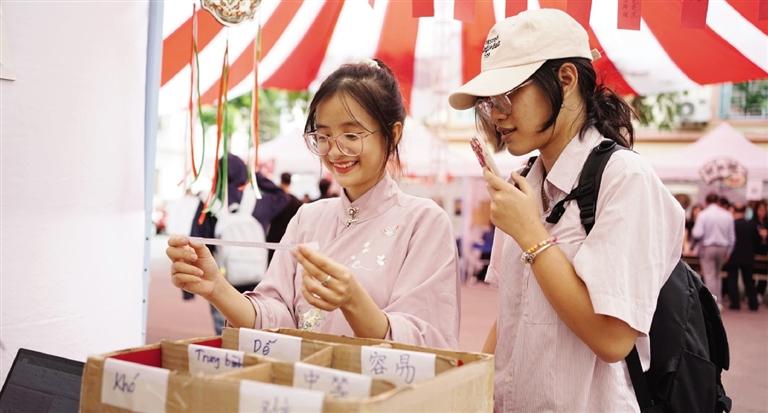 2023年11月1日,在越南河内大学,越南大学生在“同唱一首歌”中国—东盟青年影视歌会活动现场参与猜谜语游戏 新华社记者 胡佳丽 摄