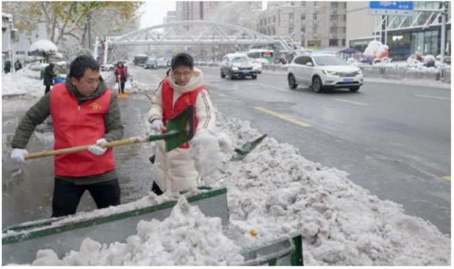 12月11日,在郑州市花园路上,志愿者清除道路积雪。12月10日至11日,受强冷空气影响,河南迎来今冬首轮大范围雨雪天气,其中郑州市出现暴雪,局部大暴雪。新华社记者 李嘉南 摄
