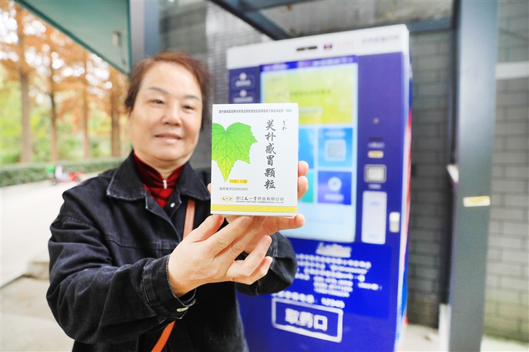 12月11日,定海区香园新村,居民洪女士在新设置的“数智药房”购买了药品。