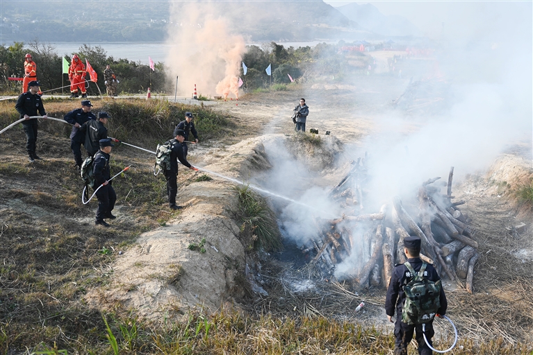 实战演练中,市资源规划局普陀分局林业管理与防火科收到火情预警信息,东港街道接到警报后,立即集结街道半专业森林消防队前往处置。由于火场风力大,火势无法得到有效控制,普陀区公安分局巡特警大队携带灭火弹、森林消防高压水泵等装备火速支援(见图)。经过扑救,现场明火扑灭,对火场余火仔细清理完毕后,演练圆满结束。