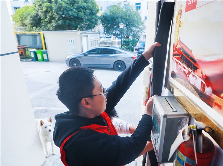 昨天,定海沿港东路111号的老旧小区,海滨社区的志愿者将裸露水管裹上“保暖衣”摄影 记者 张磊 通讯员 叶俞丰 洪春晓