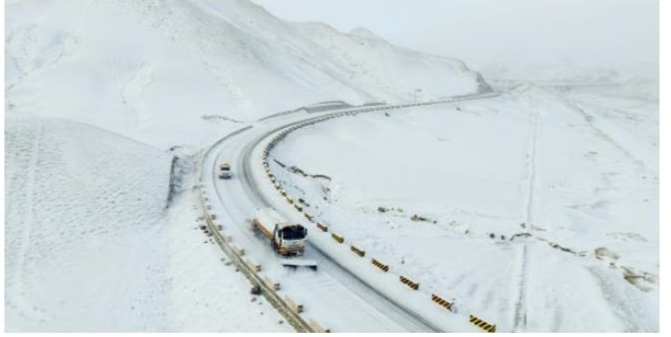 12月14日,在甘肃省酒泉市阿克塞哈萨克族自治县境内,除雪车辆在国道215线当金山路段开展打冰除雪作业(无人机照片)。