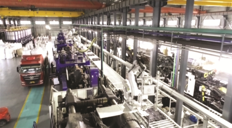 走进宝塑公司的生产车间,伴随着轰鸣声,两只“机械手”在生产线上“挥动自如”。一个个由聚丙烯为原料的立体物流托盘,24小时不间断地从全智能流水线上有序“出货”(见图)。原本需要20多名工人同时在岗的车间,现只需5名技术工人看顾机器。
