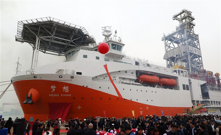 当日,我国自主设计建造的首艘大洋钻探船正式命名为“梦想”号,并在广州南沙首次试航。