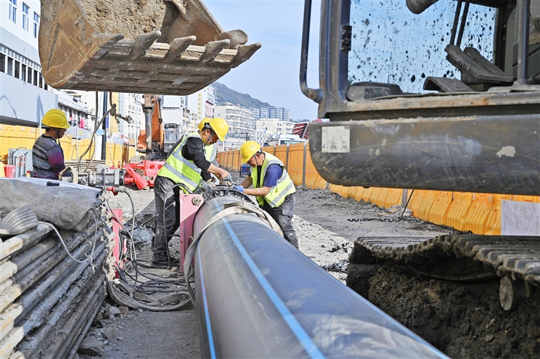 近日,在普陀区沈家门滨港路水系管网提升改造项目工地,工人们正在加紧进行牵引管焊接施工。该项目工程始于滨港公园南侧,终于沈家门海鲜夜排档西端,全长2160米,预计明年8月底完工。