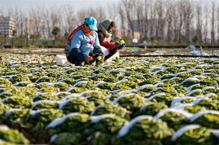 12月23日,在安徽省合肥市庐阳区大杨镇岗西村现代农业产业园,农民采收蔬菜供应市场。
