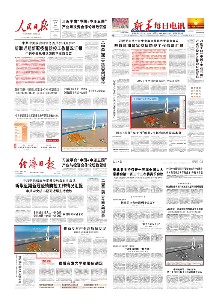 甬舟铁路建设忙 2023年2月17日,《人民日报》《新华每日电讯》《经济日报》同一天在报纸头版报道了甬舟铁路西堠门公铁大桥5号墩自浮式钻孔平台浮运到位的新闻,《光明日报》也在3版做了报道。