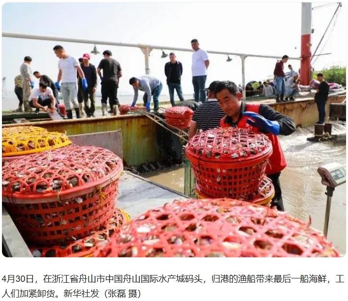 渔都港城交易忙 4月30日,中国舟山国际水产城码头,归港的渔船带来最后一船海鲜,工人们加紧卸货 新华社发