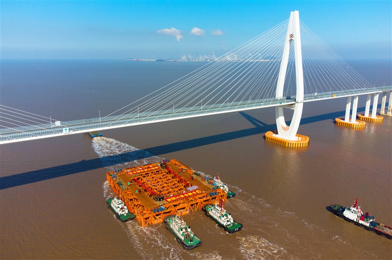 2月16日,甬舟铁路西堠门公铁大桥5号墩自浮式钻孔平台通过舟岱大桥主通航孔(无人机照片) 新华社发