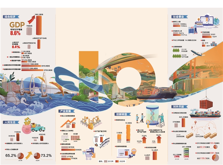 2013年,浙江舟山群岛新区正式挂牌。十年来,舟山始终牢记嘱托,深入践行“八八战略”, 坚持向海图强、向海开放,绘就了“非凡十年”跨越发展的美好画卷——