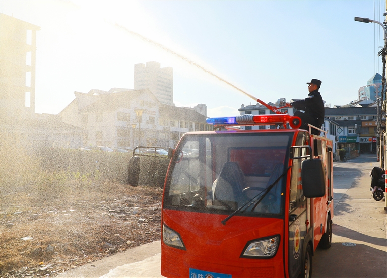 近日,定海昌国街道东管庙社区举行微型消防演习。民警和志愿者借助微型消防车,深入老街小巷,开展消防演习,守护老旧小区安全。