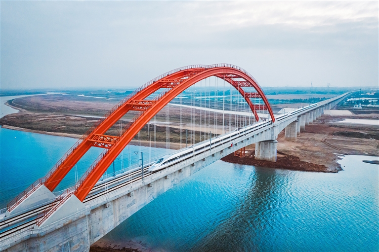12月12日,试运行列车驶过杭州至南昌高铁鄱阳湖特大桥(无人机照片)。杭州至南昌高铁黄山至南昌段(简称杭昌高铁黄昌段)将于12月27日通车,届时杭昌高铁将实现全线贯通运营。 新华社 发(张萌飞 摄)