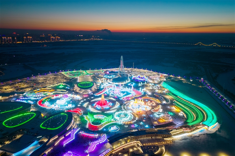 2023年12月31日,游客在哈尔滨冰雪大世界园区游玩(无人机照片)。当日是2023年的最后一天,进入旅游旺季的“冰城”哈尔滨化身“冰建世界”,吸引众人前来跨年。 新华社记者 张涛 摄