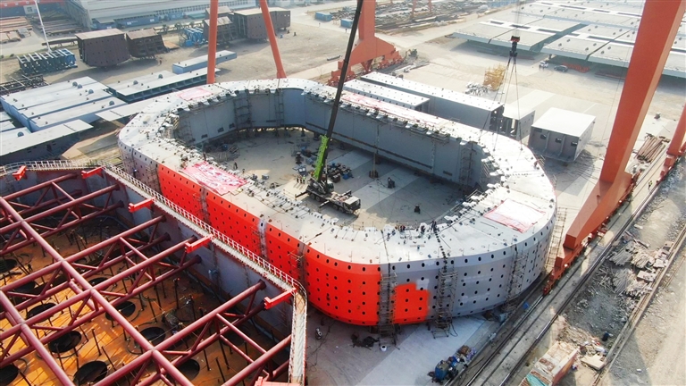 随着最后一道焊缝开始焊接,面积相当于11个标准篮球场之和的环形箱体实现“闭环”,青龙门大桥防撞套箱主体基本拼装完成(见图)。长86米、宽48米,这也是青龙门特大桥全桥钢套箱中最大的一个。