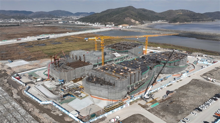 近日,岱山双峰新城体育中心项目雏形已现,从高处俯瞰,就像一只巨型蝴蝶。据了解,该项目总投资约5.99亿元,总建筑面积约5.5万平方米,由室内运动场馆、室外运动场地、相关配套用房等组成,预计2025年4月完工。 摄影 记者 陈永建