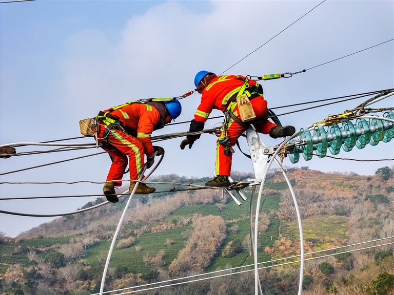 昨天下午,在舟山北塘110千伏输变电工程,国网舟山供电公司电力施工人员正在高塔上进行紧线作业,确保1月6日完成本段施工。据了解,该工程将为朱家尖旅游经济发展再添一条电力“生命线”,预计3月底建成投运。