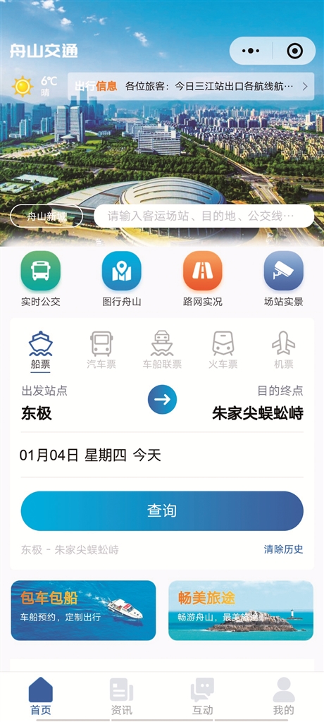 目前,我市交通部门牵头整合了全市交通出行的相关数据和信息系统,打造了全市统一的交通数字出行服务平台。2023年,为深入实施“小岛你好”海岛共富行动和“星辰大海”计划,推进交通服务领域数字化广泛赋能,“舟山交通”平台迎来了又一次迭代升级,推出了全新“3.0”版本。在原有基础上,平台进行了更多优化,该应用包含出行信息、在线购票、包车包船、畅美旅途等四大板块18个子场景服务,让公共交通服务更优质、更高效。