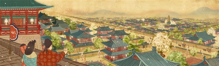 “建筑方面的绘画,是我的一个弱项。”为了画好这张插图,陆丹聆考证了唐朝建筑风格、长安城布局等,成画参考了长安城里坊平面图和西安博物院复原沙雕模型。其中的长安城里坊平面图,又参考了北宋书籍《长安志·卷七·唐京城一·外郭城》、西安碑林博物馆收藏的北宋吕大防《长安图》、西安建筑科技大学王树生教授团队研究补绘北宋《长安图》。