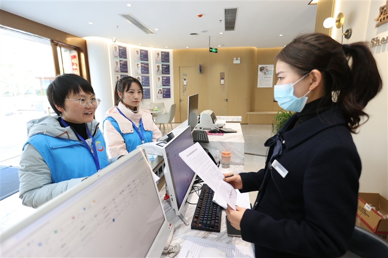 1月4日,贵州省毕节市七星关区麻园街道普查员在一家企业进行宣传并登记普查信息。