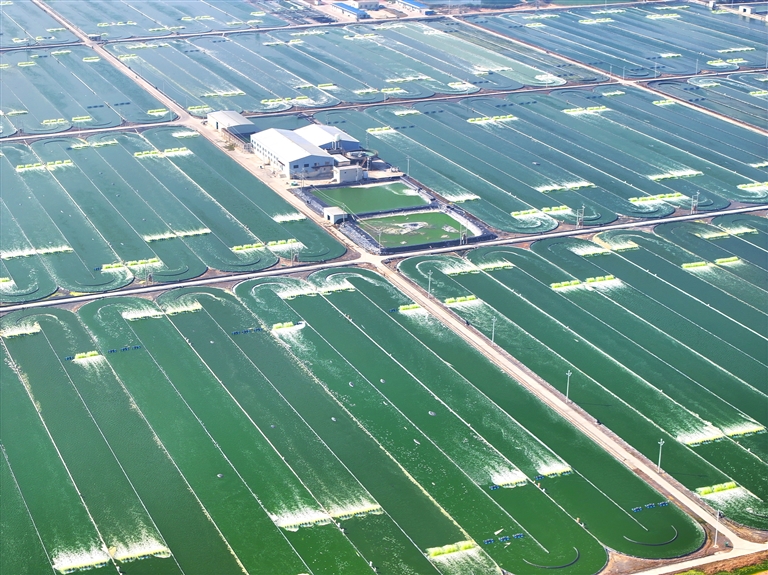 在广西防城港市港口区企沙镇山新村的微藻养殖基地,轮桨机在一条条微藻跑道式养殖池内拍出白色水花,构成一曲水上“乐章”。