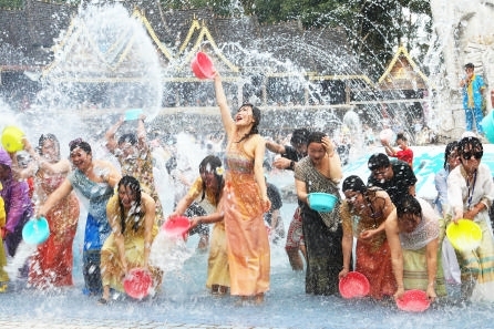 1月7日,游客在云南省景洪市傣族园景区参加泼水活动。