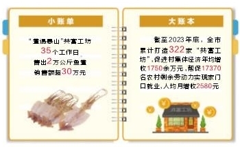 数据显示,截至2023年底,我市累计打造322家“共富工坊”,年糕、粽子、渔绳结、珐琅画等各类产品百花齐放,已促进村集体经济年均增收1750余万元,帮促17370名农村剩余劳动力实现家门口就业,人均月增收2580元。