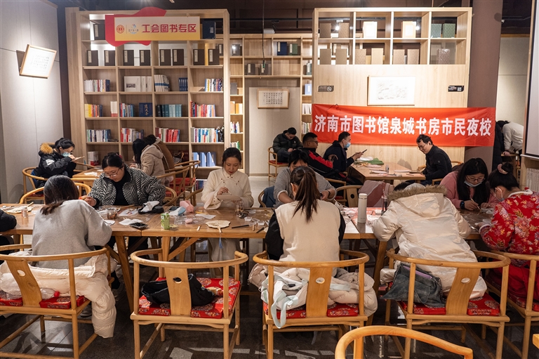 日前,济南市图书馆创办的市民夜校正式开课,吸引大批市民报名学习。据了解,市民夜校主要采用延时开放、公益性收费模式,在晚间时段为18至55岁中青年提供文化艺术普及课程,包括非遗技艺、生活美学、职场提升等,满足广大市民的多元公共文化需求。 新华社记者 朱峥 摄