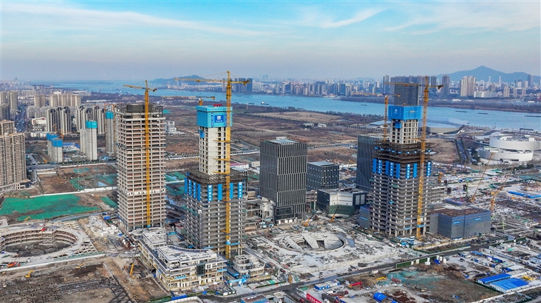 这是1月15日拍摄的江苏省南京市江北新金融中心一期项目施工现场(无人机照片)。当日,在江苏省南京市江北新金融中心一期项目施工现场,承建方中建三局运用“空中造楼机”进行项目封顶前的最后一次顶升作业,各项施工稳步推进。据介绍,该项目建造采用智能集成“空中造楼机”,提高了高层建筑施工的机械化、智能化及绿色施工水平,让“高空作业”变为“室内施工”,施工效能提升约20%。 新华社记者 李博 摄