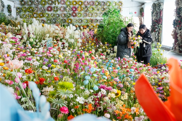 1月16日,乐亭县一家绢花生产企业的工作人员在整理绢花产品。
