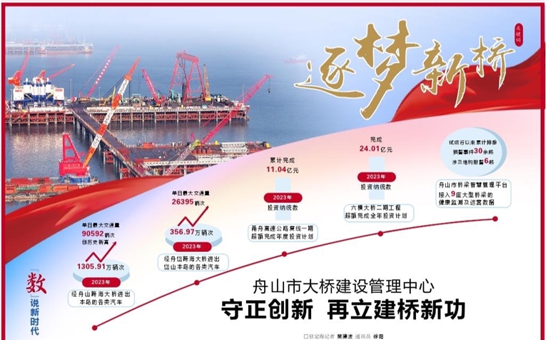 超常规推动甬舟高速公路复线一期项目,完成年度投资11.04亿元,完成年度目标的111.5%;舟山跨海大桥降费取得新突破;2023年经舟山跨海大桥进出本岛的各类汽车1305.91万辆次,单日最大交通量90592辆次,创历史新高……