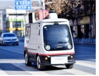 近日,无人驾驶配送车在雄安新区投入使用。收件人可以在手机APP上预约派送时间,无人驾驶配送车到达前会自动发出短信通知收件人,到达指定地点后,收件人输入取件码即可取件。据介绍,该无人驾驶配送车最大承重为1000千克,单车日配送量达到500-800单,满电续航200公里,可以实现1分钟换电。 新华社记者 王晓 摄
